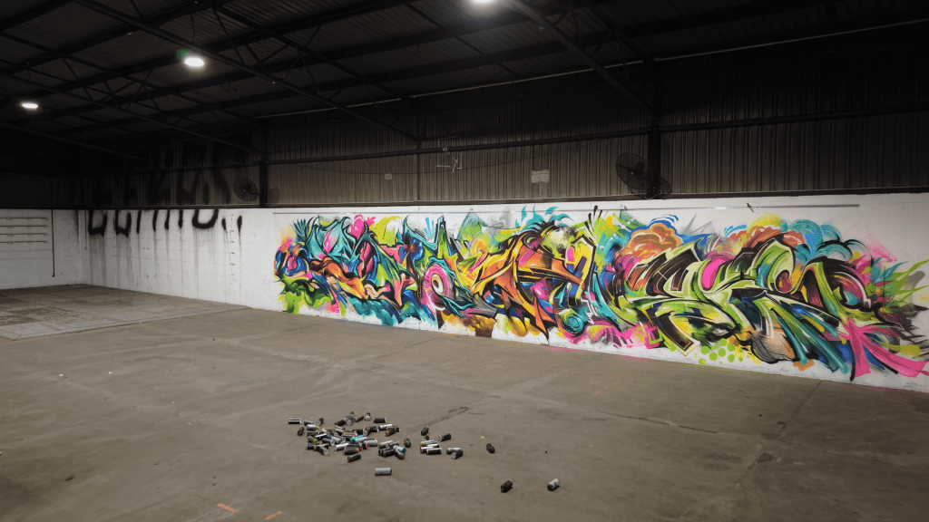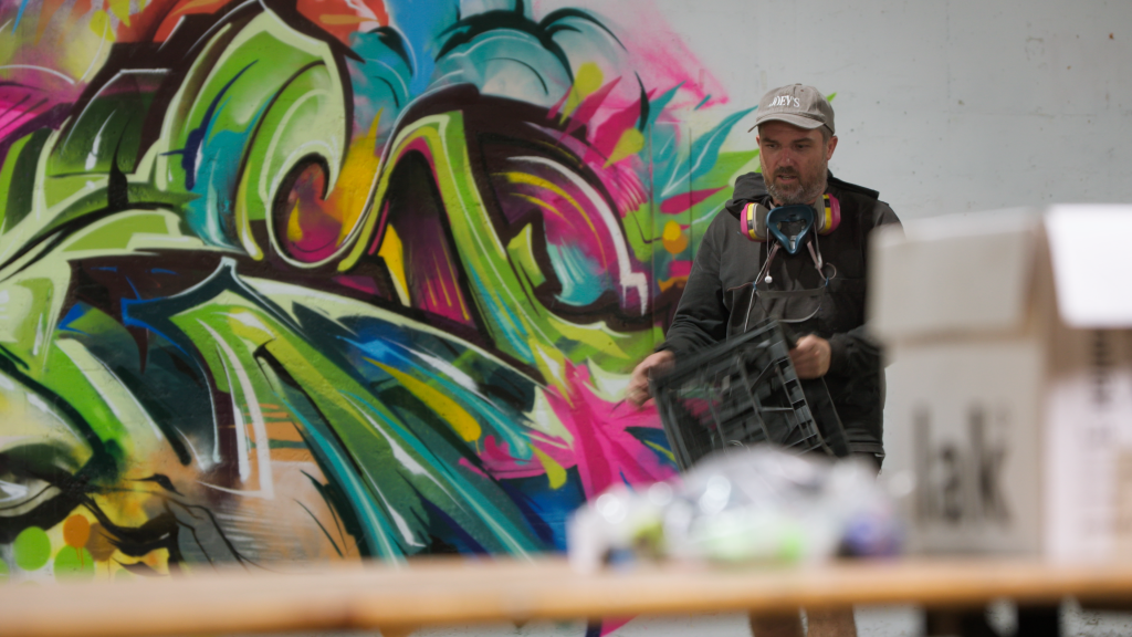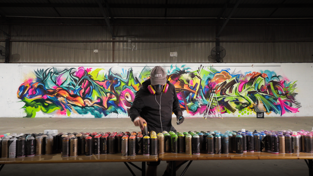 Sofles paints a large piece over 4 hours using dregs cans.